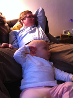 As soon as he got home Harlan rushed to the door to give him a big hug. She always does this before he leaves for work and when he gets home. As we got settled and laid on the couch as a family to watch “Gabba,” Harlan goes and lays right down on her daddy. As she is getting older she is really becoming attached to him.
