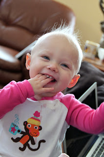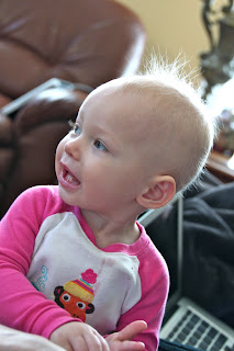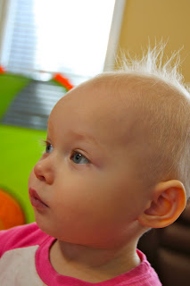 This morning Harlan woke up with her first case of bed head. Yes, she finally has enough hair on her head to get messed up during her night of sleep and stick straight up in the air.
